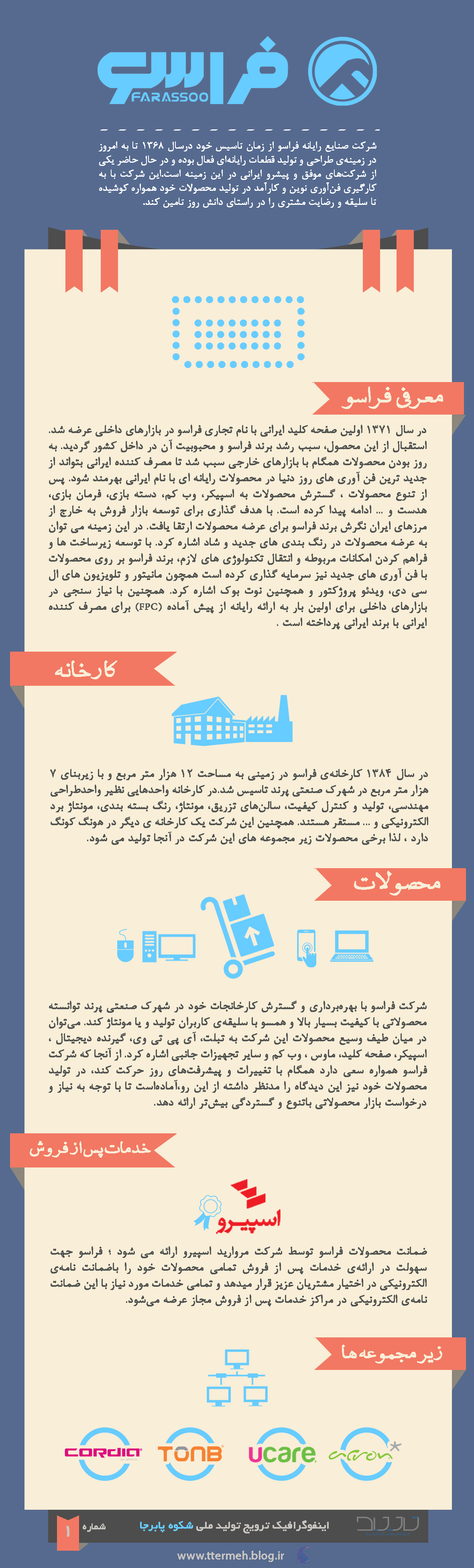 شماره 1 : در این اینفوگرافیک به معرفی شرکت صنایع رایانه فراسو پرداخته ایم ، فراسو در عرصه تولید قطعات رایانه ای فعالیت می کند .